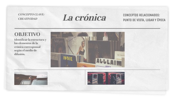 Elige la temática que te gustaría trabajar y escribe tu propia crónica. Sigue el esquema que tu docente te proporcionará.