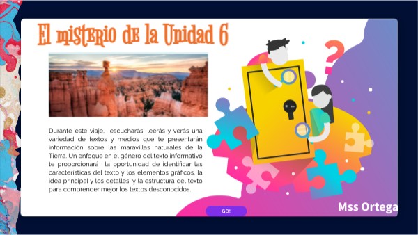 Durante este viaje, escucharás, leerás y verás una variedad de textos y medios que te presentarán información sobre las maravillas naturales de la Tierra. Un enfoque en el género del texto informativo te proporcionará la oportunidad de identificar las características del texto y los elementos gráficos, la idea principal y los detalles, y la estructura del texto para comprender mejor los textos desconocidos.