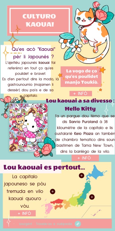 L'ajeitiéu japounés kaouai fai referènci en tout ço qu'es poulidet e bravet.Es d'en pertout dins la modo, la gastrounoumìo (majamen li dessèr) dou païs e de sa capitalo.