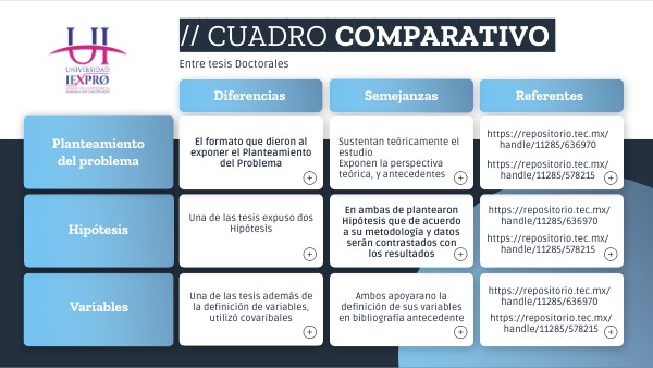 Después del análisis y reflexión de la lectura, realiza un cuadro comparativo donde plasmes las diferencias y semejanzas entre los siguientes elementos. Para comparar cada elemento deberás de buscar dos tesis doctorales y colocar en “referentes” el enlace a cada una de las tesis que seleccionaste. E