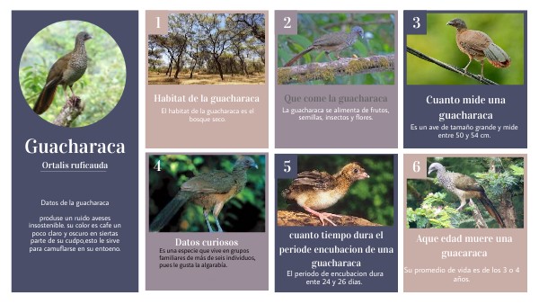Datos de la guacharaca produse un ruido aveses insostenible. su color es cafe un poco claro y oscuro en siertas parte de su cudpo,esto le sirve para camuflarse en su entoeno.