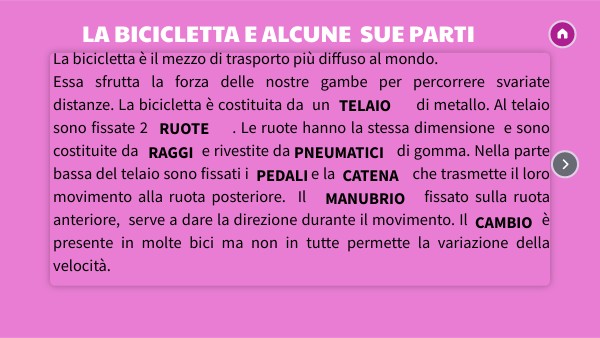 La bicicletta è il mezzo di trasporto più diffuso al mondo. Essa sfrutta la forza delle nostre gambe per percorrere svariate distanze. La bicicletta è costituita da un di metallo. Al telaio sono fissate 2 . Le ruote hanno la stessa dimensione e sono costituite da e rivestite da di gomma. Nella parte bassa del telaio sono fissati i e la che trasmette il loro movimento alla ruota posteriore. Il fissato sulla ruota anteriore, serve a dare la direzione durante il movimento. Il è presente in molte bici ma non in tutte permette la variazione della velocità.