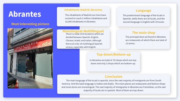 The main language of the locals is spanish, since the vast majority of immigrants are from South America. And the least language is Indian and Arabic. The main places are restaurants and fashion shops and most stores are monolingual. The vast majority of immigrants in Abrantes are Colombian, so the vast majority of locals are in spanish. Most of them are top-down.