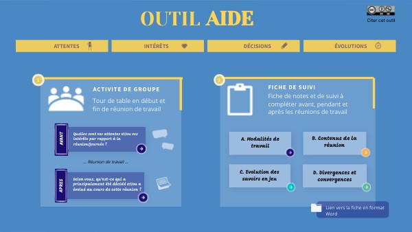 Il s'agit ici de noter les compétences principales que les personnes qui participent à la réunion vont mobiliser et potentiellement développer. Les expertises spécifiques nécessaires au bon déroulement de la réunion ou les manquements peuvent également être relevés. Cet Exemple 1 : "négociation et élaboration des objectifs d'apprentissage", "co-analyse d'une séquence d'enseignement" Exemple 2 : "découverte et mobilisation du concept de topogenèse (concept didactique) pour discuter des pratiques enseignantes"