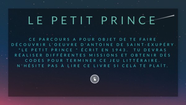 Ce parcours a pour objet de te faire découvrir l'oeuvre d'Antoine de Saint-Exupéry "le petit prince " écrit en 1943. Tu devras réaliser différentes missions et obtenir des codes pour terminer ce jeu littéraire. N'hésite pas à lire ce livre si cela te plaît.