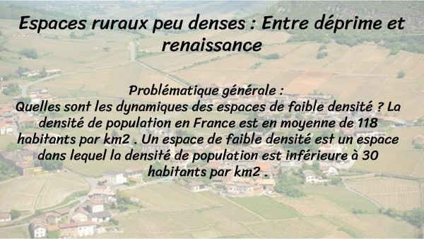 Problématique générale : Quelles sont les dynamiques des espaces de faible densité ? La densité de population en France est en moyenne de 118 habitants par km2 . Un espace de faible densité est un espace dans lequel la densité de population est inférieure à 30 habitants par km2 .