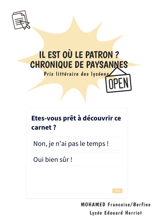 Titre : Le faux patron Justification (pourquoi ce choix ?) : Le mari n'est pas un patron car la ferme ne lui appartient pas et puis car sa femme y travaille aussi et car le passage montre le resumé de la bd