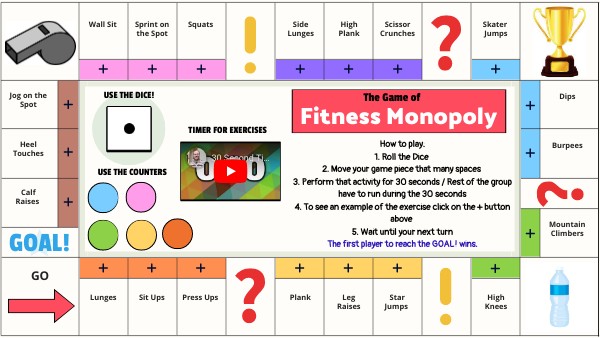 How to play:1. Roll the Dice 2. Move your game piece that many spaces 3. Perform that activity for 30 seconds / Rest of the group have to run during the 30 seconds 4. To see an example of the exercise click on the + button above 5. Wait until your next turn The first player to reach the GOAL! wins.