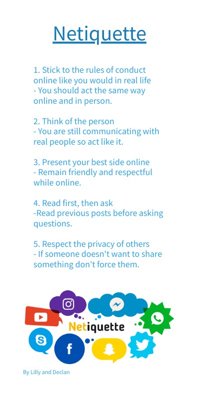 1. Stick to the rules of conduct online like you would in real life - You should act the same way online and in person. 2. Think of the person - You are still communicating with real people so act like it. 3. Present your best side online - Remain friendly and respectful while online. 4. Read first, then ask -Read previous posts before asking questions. 5. Respect the privacy of others - If someone doesn't want to share something don't force them.
