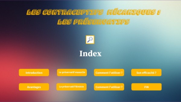 Dans ce diaporama, j'ai expliqué comment fonctionnait les préservatifs masculin et féminins. J'ai fait ce diaporama pour un exposé en cours de SVT.
