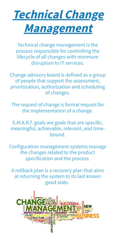 Technical change management is the process responsible for controlling the lifecycle of all changes with minimum disruption to IT services. Change advisory board is defined as a group of people that support the assessment, prioritisation, authorization and scheduling of changes. The request of change is formal request for the implementation of a change. S.M.A.R.T. goals are goals that are specific, meaningful, achievable, relevant, and time-bound. Configuration management systems manage the changes related to the product specification and the process. A rollback plan is a recovery plan that aims at returning the system to its last known good state.
