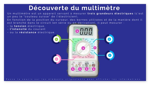 Un multimètre est un appareil servant à mesurer trois grandeurs électriques (c'est un peu le "couteau suisse" de l'électricien).En fonction de la position du curseur, des bornes utilisées et de la manière dont il est branché dans le circuit (en série ou en dérivation), il peut mesurer : - la tension électrique, - l’intensité du courant - ou la résistance électrique.