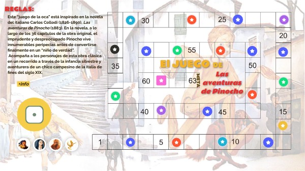 Este “juego de la oca” está inspirado en la novela del italiano Carlos Collodi (1826-1890), Las aventuras de Pinocho (1883). En la novela, a lo largo de los 36 capítulos de la obra original, el imprudente y despreocupado Pinocho vive innumerables peripecias antes de convertirse finalmente en un “niño de verdad”. Acompaña a los personajes de esta obra clásica en un recorrido a través de la infancia silvestre y aventurera de un chico campesino de la Italia de fines del siglo XIX.