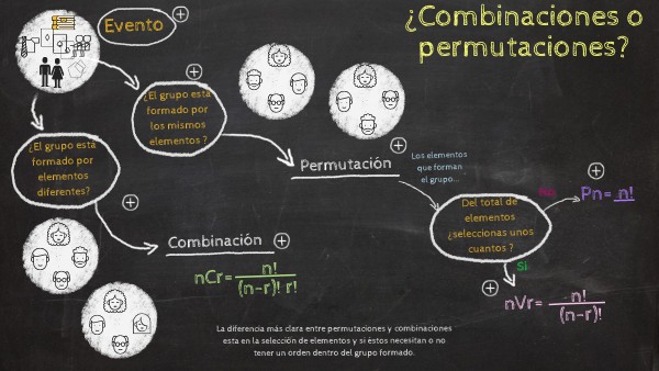 La diferencia más clara entre permutaciones y combinaciones esta en la selección de elementos y si éstos necesitan o no tener un orden dentro del grupo formado.