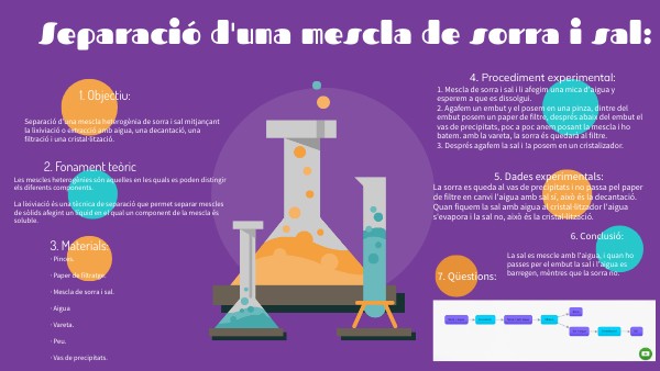 1. Mescla de sorra i sal i li afegim una mica d'aigua y esperem a que es dissolgui. 2. Agafem un embut y el posem en una pinza, dintre del embut posem un paper de filtre, després abaix del embut el vas de precipitats, poc a poc anem posant la mescla i ho batem. amb la vareta, la sorra és quedarà al filtre. 3. Després agafem la sal i !a posem en un cristalizador.