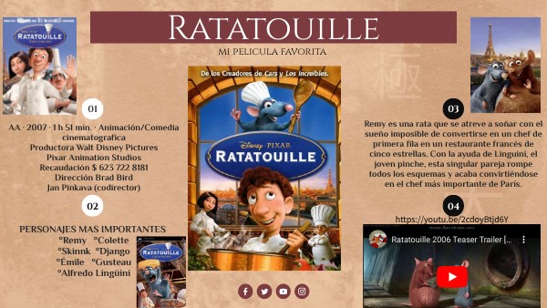 AA · 2007 · 1 h 51 min. · Animación/Comedia cinematografica Productora Walt Disney Pictures Pixar Animation Studios Recaudación $ 623 722 8181 Dirección Brad Bird Jan Pinkava (codirector)
