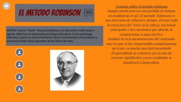 Ventajas sobre el metodo robinson:Aunque pueda parecer una perdida de tiempo, en realidad no es asi. El metodo Robinson es una inversion de esfuerzo y tiempo. al tener toda la estructura del texto en la cabeza, sus temas principales y las cuestiones que aborda, la comprension es mas efectiva. Tambien lo es la memorizacion del contenido. una vez que se ha comprendido completamente un texto, es mucho mas facil recordarlo El aprendizaje se convierte asi en uno de caracter significativo cuyos resultados se mantienen a largo plazo.
