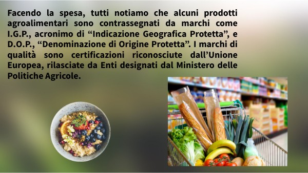 Facendo la spesa, tutti notiamo che alcuni prodotti agroalimentari sono contrassegnati da marchi come I.G.P., acronimo di “Indicazione Geografica Protetta”, e D.O.P., “Denominazione di Origine Protetta”. I marchi di qualità sono certificazioni riconosciute dall’Unione Europea, rilasciate da Enti designati dal Ministero delle Politiche Agricole.