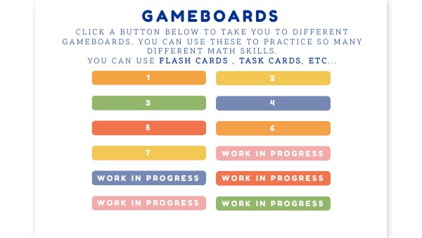 Click a button below to take you to different gameboards. You can use these to practice so many different math skills. You can use flash cards , task cards, etc...
