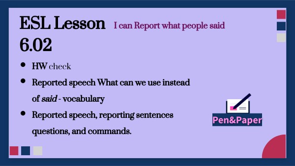 - Reported speech, reporting sentences questions, and commands.