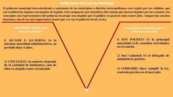 El gobierno municipal descentralizado o autónomo de los municipios o distritos metropolitanos está regido por los cabildos, que son también los órganos encargados de legislar. Está compuesto por miembros del consejo que fueron elegidos por los votantes, los concejales son representantes del gobierno local que son elegidos por el público en general cada cuatro años. Aunque hay muchas funciones, dos de las más importantes tienen que ver con el gobierno local y la ley.