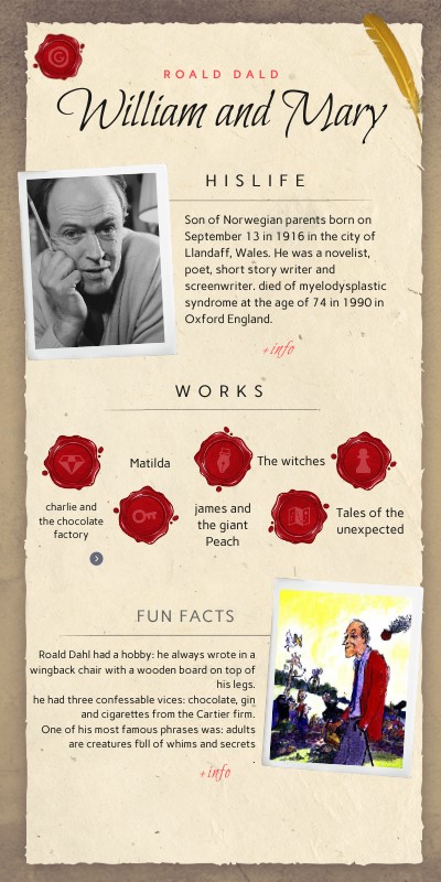 Roald Dahl had a hobby: he always wrote in a wingback chair with a wooden board on top of his legs. he had three confessable vices: chocolate, gin and cigarettes from the Cartier firm. One of his most famous phrases was: adults are creatures full of whims and secrets .