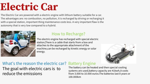 The Electric Car are powered with a electric engine with lithium battery suitable for a car.The advantages are: no combustion, no pollution, it is recharged by driving or recharging it with a special station, important thing maintenance costs less. A very important flaw is the autonomy that is very low compared to a hybrid.