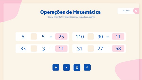 Coloca os simbolos matemáticos nos respectivos lugares.