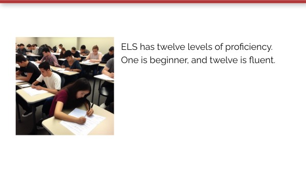 ELS has twelve levels of proficiency. One is beginner, and twelve is fluent.