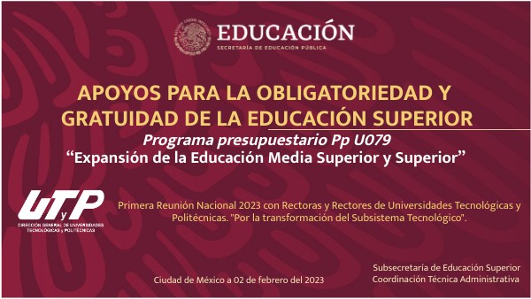 El Gobierno de la República a través de la Secretaría de Educación Pública (SEP), tiene como propósito esencial crear condiciones que permitan asegurar el acceso de las mexicanas y mexicanos, a una educación de excelencia con equidad, universalidad e integralidad, en el nivel y modalidad que la requieran y en el lugar donde la demanden. Corresponde a la Subsecretaría de Educación Superior (SES) implementar las políticas públicas para el tipo superior y operar programas federales, como es: el Programa presupuestario (Pp.) U079 "Expansión de la Educación Media Superior y Superior". Que hasta 2023, es el único instrumento idóneo para orientar la asignación y el ejercicio de los recursos públicos federales, mismos que impulsan acciones en favor de la obligatoriedad y gratuidad a través de subsidios y apoyos a proyectos concursables de las IPES, que cumplan alguno de los objetivos: