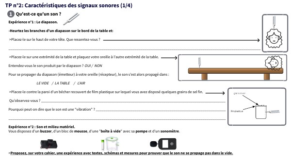 Expérience n°1 : Le diapason. -Heurtez les branches d'un diapason sur le bord de la table et: >Placez-le sur le haut de votre tête. Que ressentez-vous ? __________________________________________________________________________________________________________________________________ >Placez-le sur une extrémité de la table et plaquez votre oreille à l'autre extrémité de la table. Entendez-vous le son produit par le diapason ? OUI / NON Pour se propager du diapason (émetteur) à votre oreille (récepteur), le son s'est alors propagé dans : LE VIDE / LA TABLE / L'AIR >Placez-le contre la paroi d'un bécher recouvert de film plastique sur lequel vous avez disposé quelques grains de sel fin. Qu’observez-vous ? _______________________________________________________________________________________________ Pourquoi peut-on dire que le son est une "vibration" ? ___________________________________________________________________ ________________________________________________________________________________________________________________ Expérience n°2 : Son et milieu matériel. Vous disposez d'un buzzer, d'un bloc de mousse, d'une "boîte à vide" avec sa pompe et d'un sonomètre. >Proposez, sur votre cahier, une expérience avec textes, schémas et mesures pour prouver que le son ne se propage pas dans le vide.