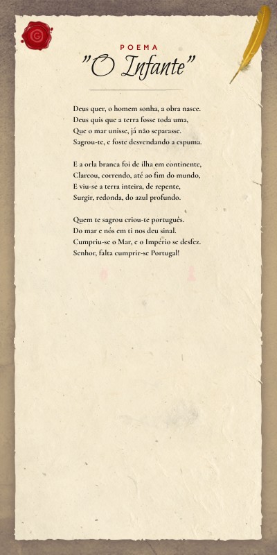 Deus quer, o homem sonha, a obra nasce. Deus quis que a terra fosse toda uma, Que o mar unisse, já não separasse. Sagrou-te, e foste desvendando a espuma. E a orla branca foi de ilha em continente, Clareou, correndo, até ao fim do mundo, E viu-se a terra inteira, de repente, Surgir, redonda, do azul profundo. Quem te sagrou criou-te português. Do mar e nós em ti nos deu sinal. Cumpriu-se o Mar, e o Império se desfez. Senhor, falta cumprir-se Portugal!