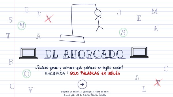 ¿Cómo jugar?Haz clic sobre las letras para ir formando la palabra. Cuando se falla se marca una de las partes del cuerpo del monigote para ir contando. Tienes hasta 6 oportunidades para adivinar. RECUERDA: Cada que falles da click en las partes del cuerpo que estén de color gris, si logras terminar la palabra antes de terminar el dibujo del ahorcado anotate un punto. Si terminas la palabra da click en la palomita verde y después a la flecha para seguir en la siguiente página. Por cada palabra hay una pista en inglés ¡suerte!