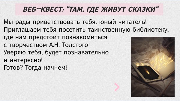 Мы рады приветствовать тебя, юный читатель!Приглашаем тебя посетить таинственную библиотеку, где нам предстоит познакомиться с творчеством А.Н. Толстого Уверяю тебя, будет познавательно и интересно! Готов? Тогда начнем!