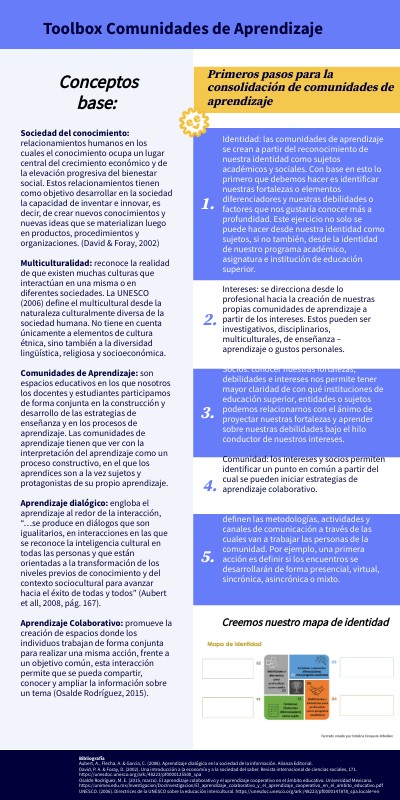 Identidad: las comunidades de aprendizaje se crean a partir del reconocimiento de nuestra identidad como sujetos académicos y sociales. Con base en esto lo primero que debemos hacer es identificar nuestras fortalezas o elementos diferenciadores y nuestras debilidades o factores que nos gustaría conocer más a profundidad. Este ejercicio no solo se puede hacer desde nuestra identidad como sujetos, si no también, desde la identidad de nuestro programa académico, asignatura e institución de educación superior. Intereses: se direcciona desde lo profesional hacia la creación de nuestras propias comunidades de aprendizaje a partir de los intereses. Estos pueden ser investigativos, disciplinarios, multiculturales, de enseñanza – aprendizaje o gustos personales. Socios: conocer nuestras fortalezas, debilidades e intereses nos permite tener mayor claridad de con qué instituciones de educación superior, entidades o sujetos podemos relacionarnos con el ánimo de proyectar nuestras fortalezas y aprender sobre nuestras debilidades bajo el hilo conductor de nuestros intereses. Comunidad: los intereses y socios permiten identificar un punto en común a partir del cual se pueden iniciar estrategias de aprendizaje colaborativo. Estrategias de trabajo: en esta etapa se definen las metodologías, actividades y canales de comunicación a través de las cuales van a trabajar las personas de la comunidad. Por ejemplo, una primera acción es definir si los encuentros se desarrollarán de forma presencial, virtual, sincrónica, asincrónica o mixto.