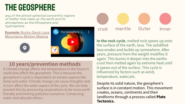 If climate change affects the temperature in the future it could also affect the geosphere. This is because the geosphere's cycle is dependent on certain aspects like temp and water. Climate change can cause droughts and in turn affect the water aspect of the cycle. We can help prevent this by pressuring corporations to be more earth friendly and limiting pollution ourselves. Conserving water and educate others.