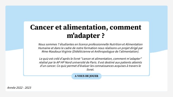 Nous sommes 7 étudiantes en licence professionnelle Nutrition et Alimentation Humaine et dans le cadre de notre formation nous réalisons un projet dirigé par Mme Masdoua Virginie (Diététicienne et Anthropologue de l'alimentation). Le quiz est créé d'après le livret "cancer et alimentation, comment m'adapter" réalisé par le AP HP Nord université de Paris. Il est destiné aux patients atteints d'un cancer. Ce quiz permet d'évaluer les connaissances acquises à travers le livret.