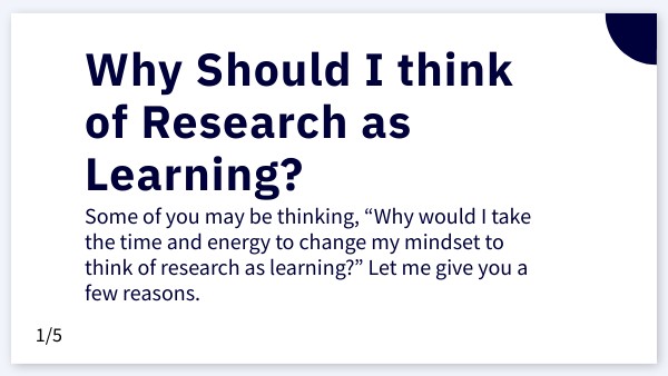 Some of you may be thinking, “Why would I take the time and energy to change my mindset to think of research as learning?” Let me give you a few reasons.