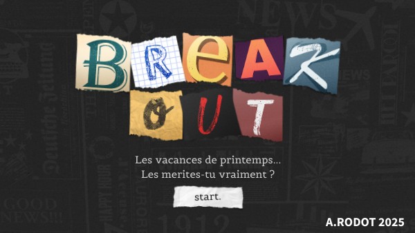 Tu as passé plus de 8 mois en 5ème ...Pourras-tu partir en vacances de printemps?Pour cela il faudra remplir un certain nombre de missions. Pour chaque mission accomplie, tu recevras un numéro faisant partie du code pour ouvrir la malette dans laquelle se trouve ta récompense et la possibilté de partir en vacances !Récupère vite tous les numéros ! Good luck !
