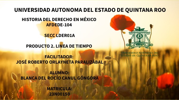 HISTORIA DEL DERECHO EN MÉXICO AFDEDE-104 SECC LDER01A PRODUCTO 2. LINEA DE TIEMPO FACILITADOR: José Roberto Orlayneta Paralizábal ALUMNO: BLANCA DEL ROCÍO CANUL GÓNGORA MATRICULA: 23N00150