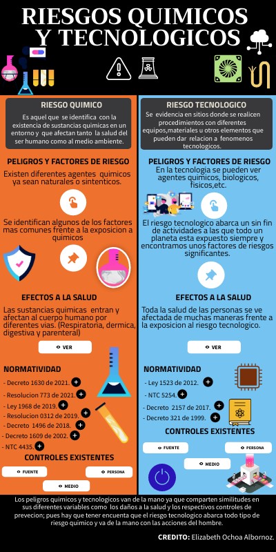 Los peligros quimicos y tecnologicos van de la mano ya que comparten similitudes en sus diferentes variables como los daños a la salud y los respectivos controles de prevecion; pues hay que tener encuenta que el riesgo tecnologico abarca todo tipo de riesgo quimico y va de la mano con las acciones del hombre.
