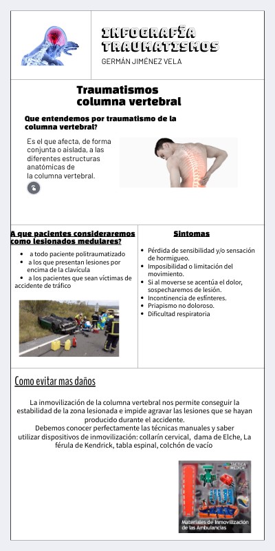La inmovilización de la columna vertebral nos permite conseguir la estabilidad de la zona lesionada e impide agravar las lesiones que se hayan producido durante el accidente.Debemos conocer perfectamente las técnicas manuales y saber utilizar dispositivos de inmovilización: collarín cervical, dama de Elche, La férula de Kendrick, tabla espinal, colchón de vacío