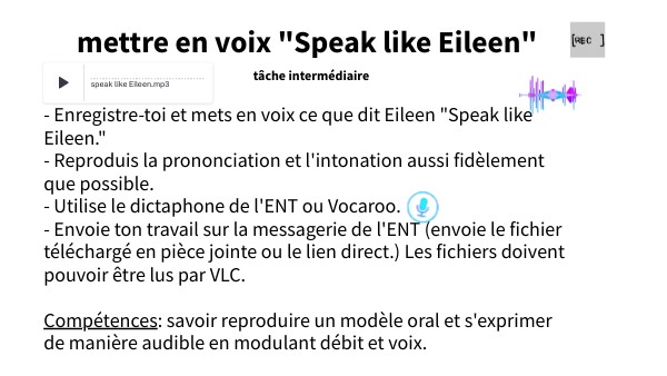 - Enregistre-toi et mets en voix ce que dit Eileen "Speak like Eileen." - Reproduis la prononciation et l'intonation aussi fidèlement que possible. - Utilise le dictaphone de l'ENT ou Vocaroo. - Envoie ton travail sur la messagerie de l'ENT (envoie le fichier téléchargé en pièce jointe ou le lien direct.) Les fichiers doivent pouvoir être lus par VLC. Compétences: savoir reproduire un modèle oral et s'exprimer de manière audible en modulant débit et voix.