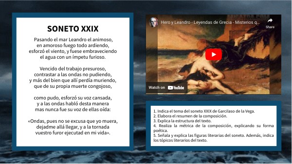 1. Indica el tema del soneto XXIX de Garcilaso de la Vega. 2. Elabora el resumen de la composición. 3. Explica la estructura del texto. 4. Realiza la métrica de la composición, explicando su forma poética. 5. Señala y explica las figuras literarias del soneto. Además, indica los tópicos literarios del texto.