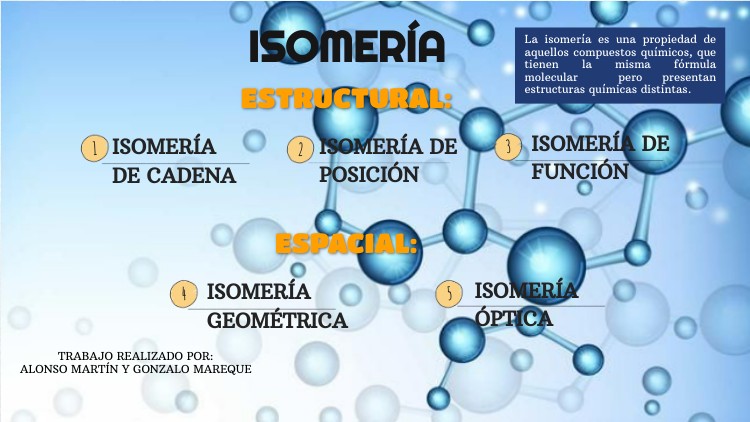 La isomería es una propiedad de aquellos compuestos químicos, que tienen la misma fórmula molecular pero presentan estructuras químicas distintas.