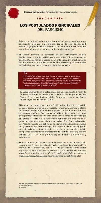 - El Estado fascista se convierte en un instrumento político, institucional y administrativo para que estas élites cumplan su destino. De esta forma, el Estado es un ente superior y prácticamente místico, donde su autoridad subordina los intereses y las voluntades individuales, y valora el orden y la disciplina para ello.