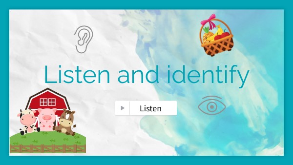 -Identify farm animals. / Identifica los animales de la granja.-Point the fruits: apple, pear, banana, pineapple, / Señala las frutas: manzana, pera, cambur y piña.