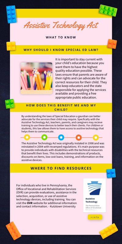 By understanding the laws of Special Education a gaurdian can better adovcate for the services their child may require. Specfically with the Assistive Technology Act, teachers, parents, and caregivers may recieve training to use these devices to better teach their clients. For children or students, this law allows them to have access to assitive technology that helps them to communicate.