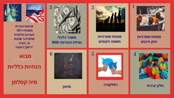 תלמידים יקריםבתקופה האחרונה למדנו בהרחבה על השגשוג הכלכלי בארצות הברית לאחר המלחמה הגדולה, ועל מגמות של פתיחות וקדמה בתחום הכלכלי- ליברליזם כלכלי לצד מגמות אילו היו גם מגמות של שמרנות וסגרנות שבאו לידי ביטוי בפגיעה בזכויות הפרט ובגילויי גזענות. בנוסף- לאחר השגשוג הכלכלי הגיע " השפל הכלכלי" והמשבר גדול בעבודה זו תכירו את המגמות השמרניות שהיו באותה תקופה ו"תעלו " שלב בלמידה – לשלב שבו אתם מקשרים בין אירועים שהיו בהיסטוריה הרחוקה לבין אירועים מהמציאות של חיינו כיום- ומנתחים אירועים על סמך הידע שצברתם בלימוד ההיסטוריה. בנוסף תלמדו את הסיבות למשבר הגדול ותחברו בין ההיסטוריה של העבר להווה של ימינו
