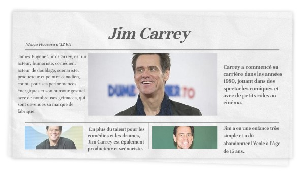 James Eugene "Jim" Carrey, est un acteur, humoriste, comédien, acteur de doublage, scénariste, próducteur et peintre canadien, connu pour ses performances énergiques et son humour gestuel avec de nombreuses grimaces, qui sont devenues sa marque de fabrique.